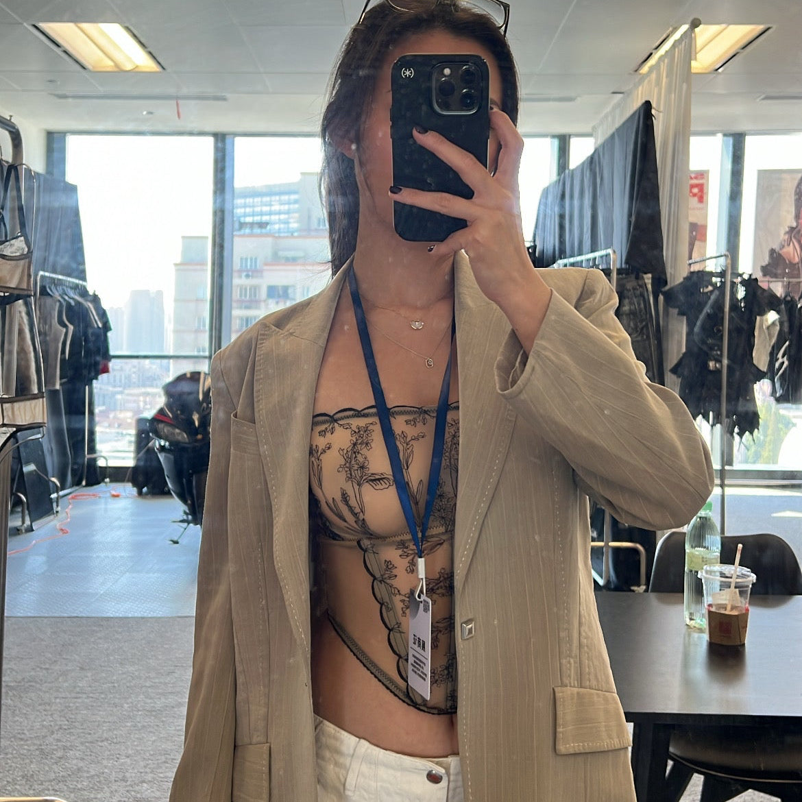 Across the bodice, intricate floral embroidery traces the skin like fine line tattoos — sensual, intentional, unforgettable. After 3 rounds of sampling, we refined the cut to perfection: